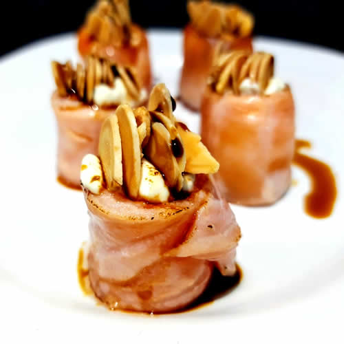 Bolinho de arroz envolto de salmão selado com amêndoas e tarê.