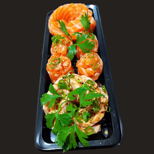 16 PEÇAS: 6 sashimis de salmão; 6 sashimis de salmão tataki e 4 dyo de salmão