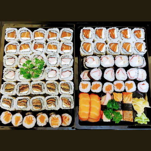 20 uramaki salmão fila; 10 uramaki kani fila; 10 uramaki skin fila; 15 hossomaki