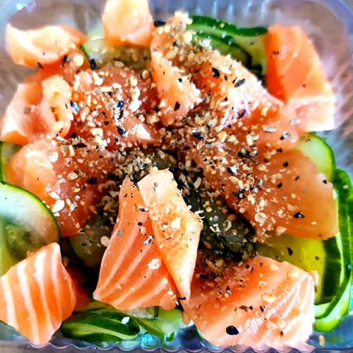 Pepino japonês marinado ao molho su com salmão. (140 gramas).