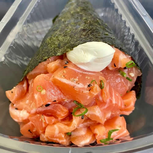 Alga, arroz, cream cheese, salmão e cebolinha.